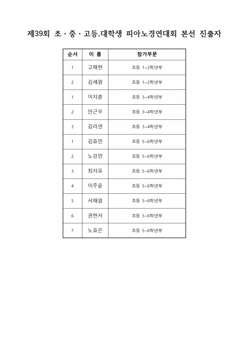 [예선결과] 2023 피아노 경연대회 초등부 예선 결과