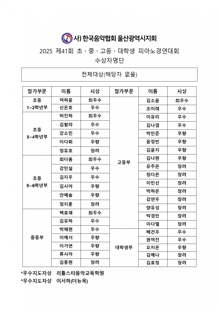 2025 제 41회 울산음악협회 피아노경연대회 수상자명단